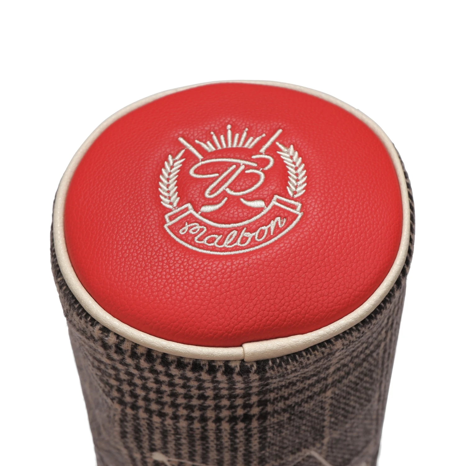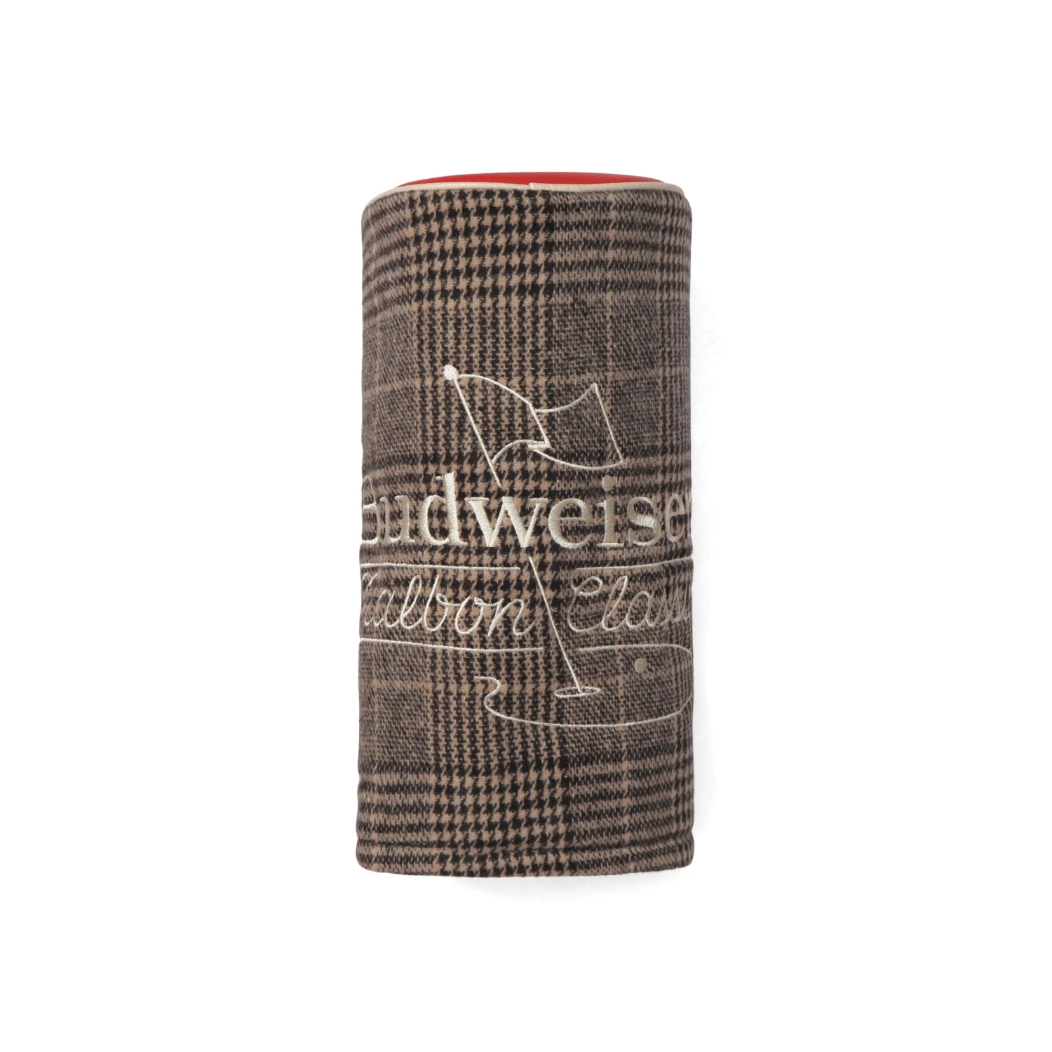 The Malbon x Budweiser Cylindrical Driver Headcover is made of 100% Genuine Leather Panels and Washed Cotton Twill. Features a Malbon x Budweiser Logo Embroidered on Center and an Embroidered Logo on Top. Malbon Script Woven Flag Label on Back.